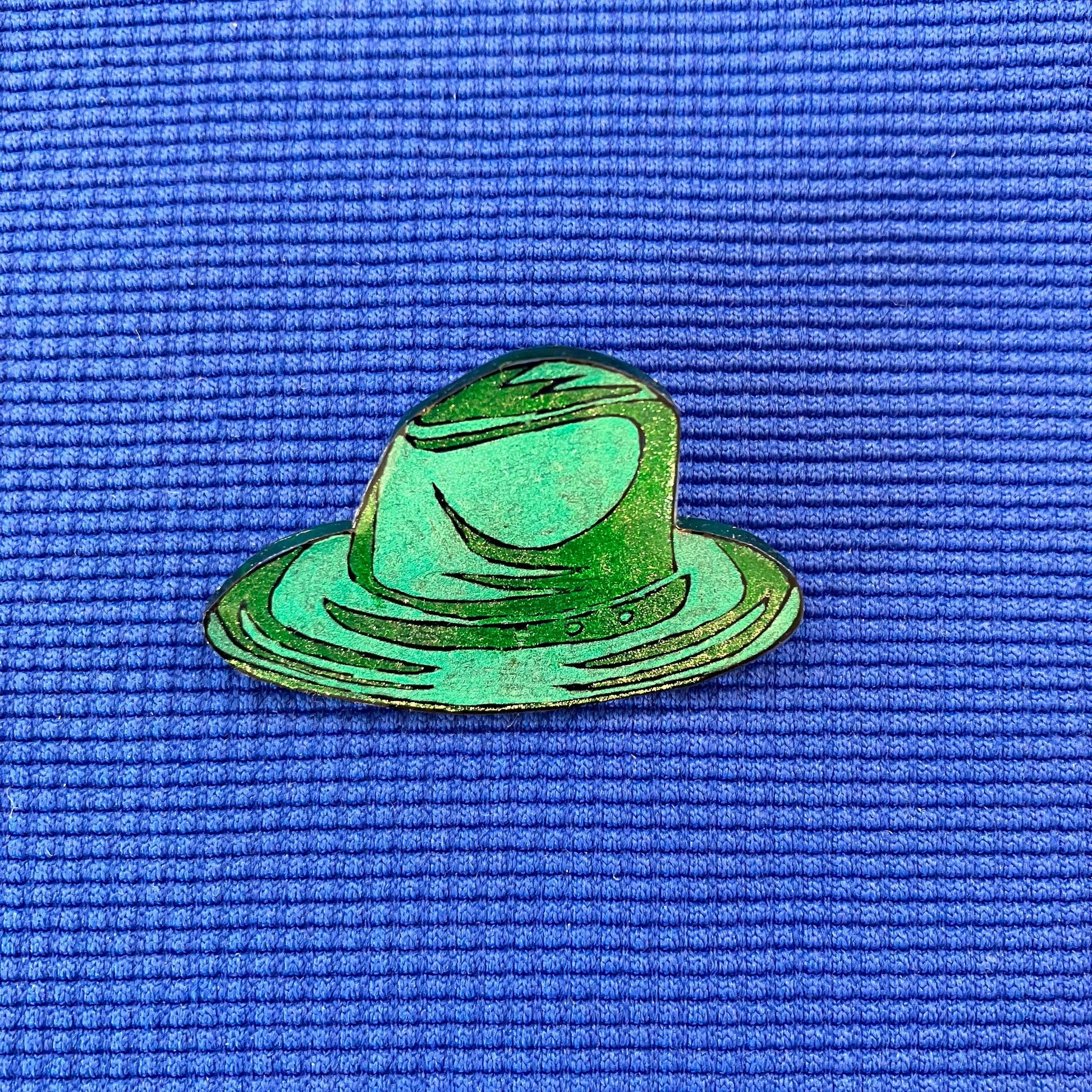 Broche représentant un chapeau vert pomme pailleté avec des ombres vert foncé pailleté