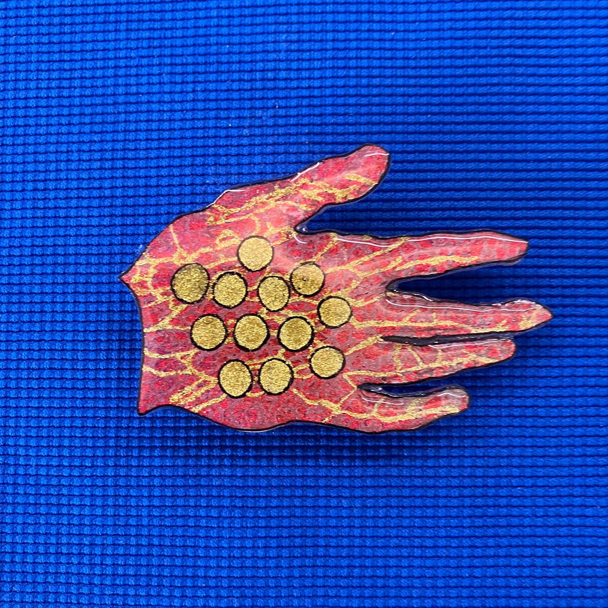 Broche représentant une main rouge avec des ronds et des veines dorées