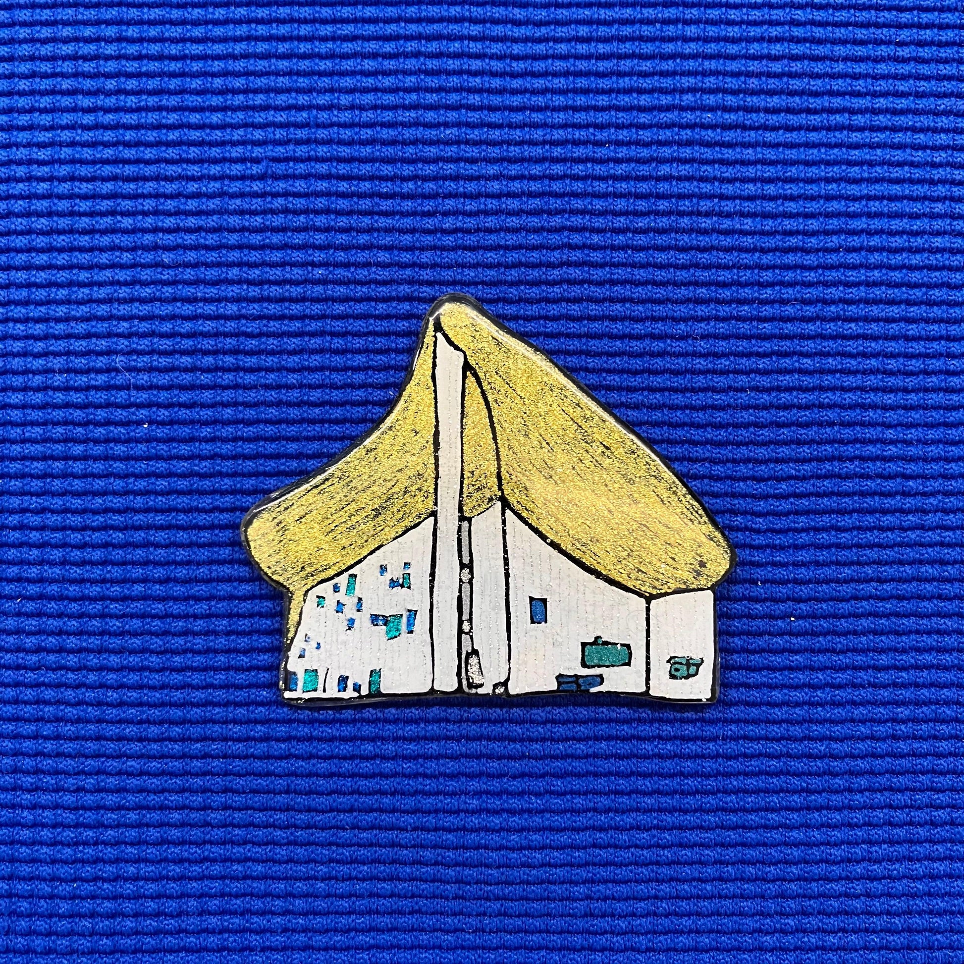 Broche représentant une interprétation de la chapelle Notre-Dame du Haut à Ronchamp construite par Le Corbusier, motif bleu pailleté et vert pailleté sur fond blanc, toit jaune pailleté